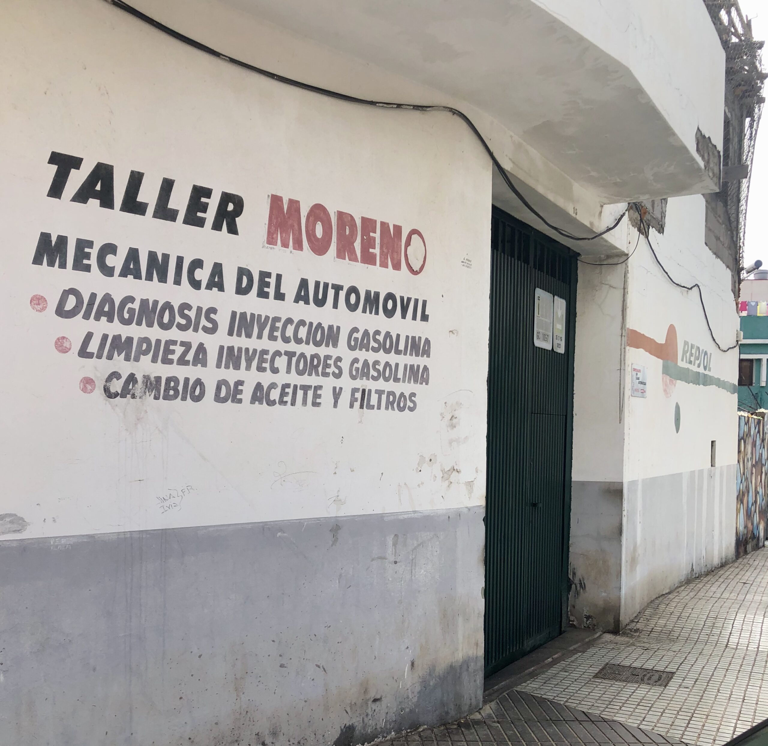 En el barrio de La Isleta de la capital grancanaria hay un rótulo superviviente, todavía en activo, de la vieja escuela. Ignoramos las décadas que lleva ahí, pero todavía luce claro y legible, en mejor estado que muchos jóvenes vinilos y metacrilatos cercanos. El rótulo es muy eficaz; tiene un diseño equilibrado, una tipografía bien elegida y una jerarquía de los textos bien establecida. Las sombras en las letras de MORENO casi se han perdido, pero revelan un recurso bien ejecutado.