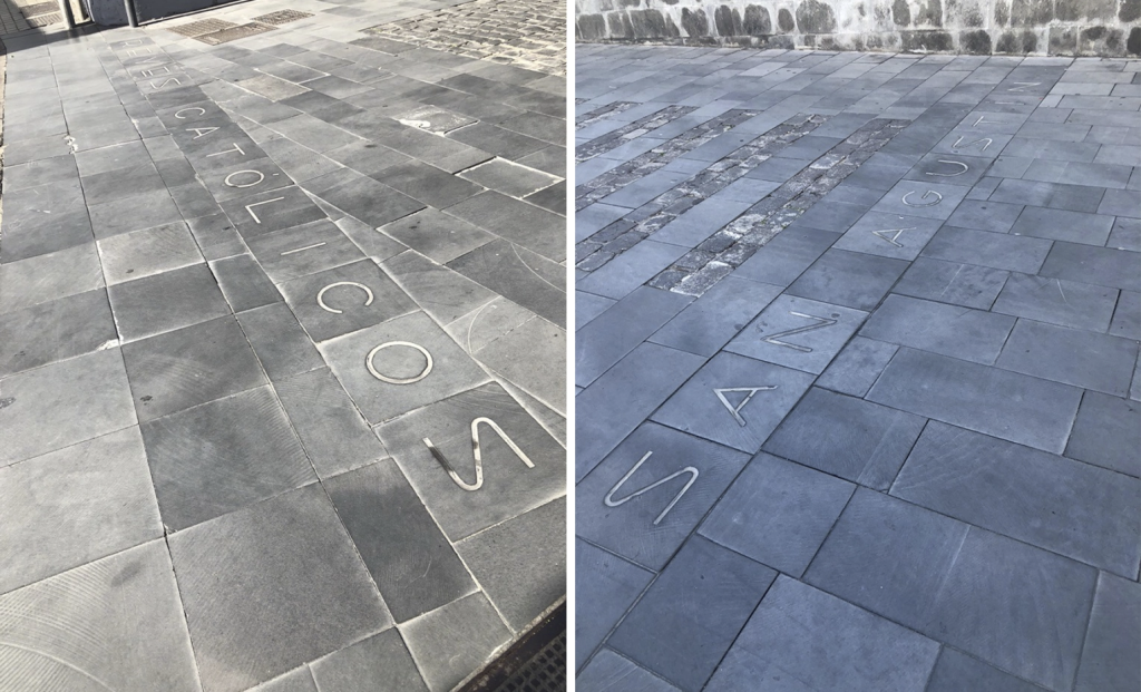 Admitámoslo: no podemos ser castañuelas todos los días. Todos tenemos momentos en los que nos asalta el desasosiego, nos atenazan las preocupaciones, sentimos en nuestra espalda el peso asombroso del mundo y no nos dan las fuerzas para erguir la cabeza y mirar hacia delante. Son justo esos momentos los indicados para pasear por las calles Reyes Católicos y Mendizábal y disfrutar de estos inopinados rótulos de suelo. Porque tenemos derecho, qué diablos, a admirar estas letras tan bien talladas aun en plena bajona. Entrenemos guapamente los músculos del cuello con innumerables rotaciones para leer los rótulos del suelo mientras nos preguntamos quiénes somos, a dónde vamos, de dónde venimos.