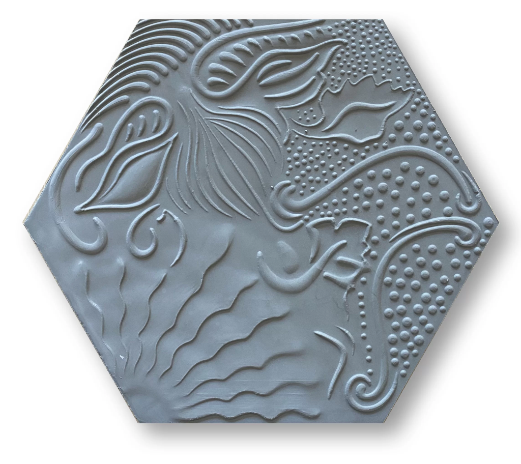Su innovadora forma hexagonal rompió con la tradición de baldosa cuadrada. Contiene tres formas inspiradas en elementos del mar: en el caso de la caracola, un fósil de caracola de la clase amonites, una estrella de mar, versión de equinodermus de la clase Ophiroideus, y unas algas de tipo talofita, del género sargassum. El dibujo completo se puede ver combinando siete baldosas. Otra peculiaridad es su carácter monocromático; los colores se sustituyen por las luces y sombras que aporta el relieve. Este pavimento consiguió formar parte de la exposición permanente del MOMA de Nueva York por ser considerado uno de los primeros productos de diseño industrial.