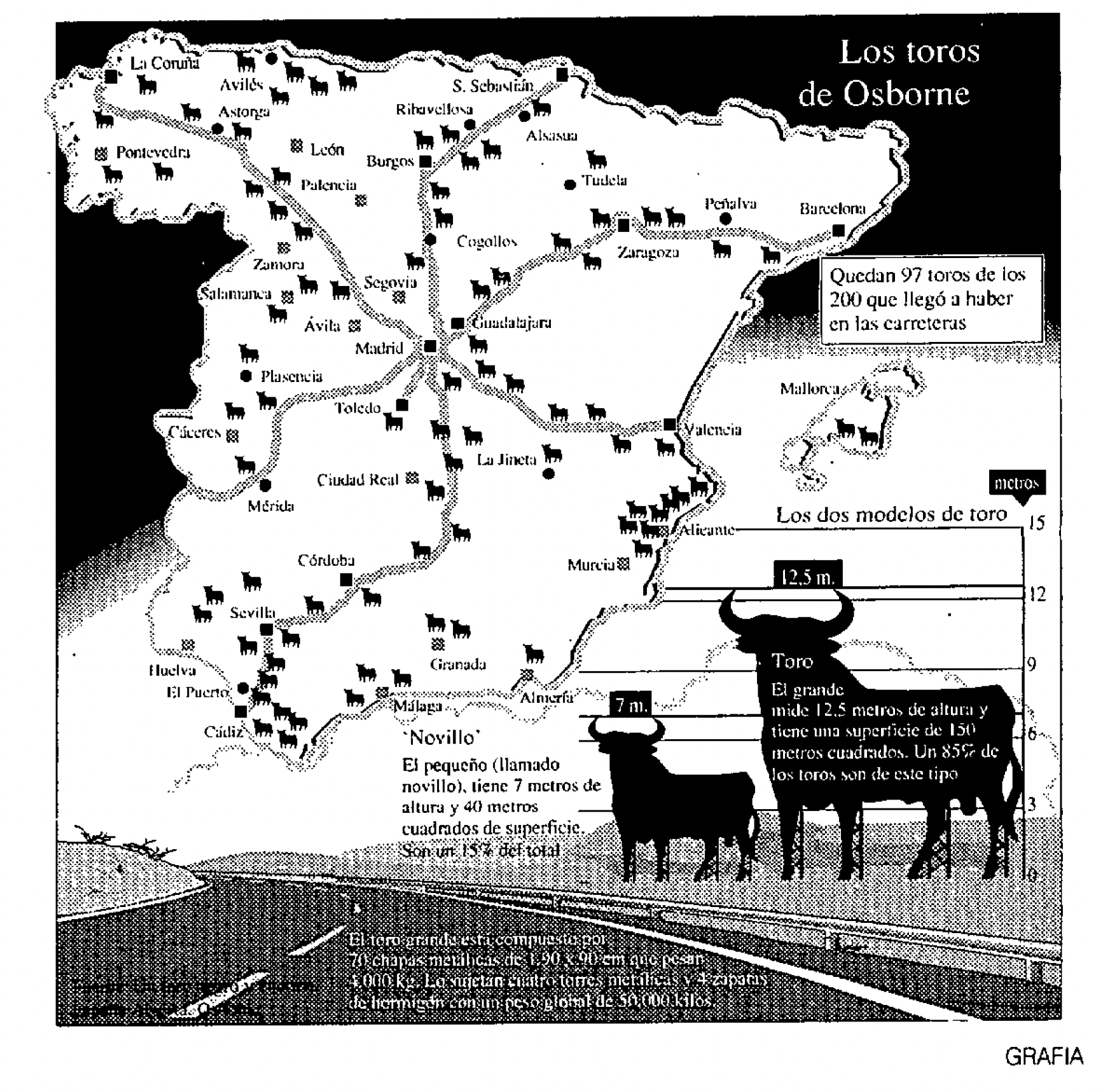 En 1962, la Dirección General de Carreteras publicó una norma que obligaba a retirar 20 metros toda la publicidad en las carreteras para no distraer a los conductores. José Antonio Osborne convirtió la obligación en oportunidad: estarían más lejos, sí, pero serían más grandes, «tanto como lo que quepa en un camión”, decidió. Así es como los toros de Osborne pasaron de 7 a 14 metros y alcanzaron los 4.000 kilos de peso. En 1974, otro decreto obligó a retirar la publicidad hasta 50 metros, por lo que tuvieron que ser todos reubicados de nuevo. Según la información ofrecida por el estudio de Manolo Prieto, la silueta estaba compuesta por sesenta chapas metálicas de 190 x 90 cm con una una superficie total de 150 metros cuadrados, alcanzando un peso de 4.000 kilos, más de mil tornillos sujetos por dobles tuercas, cuatro torretas metálicas apoyadas en sendas zapatas de seis metros cúbicos de hormigón, con un peso total aproximado de 50 toneladas.