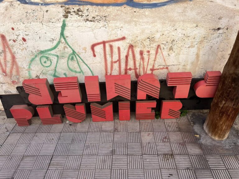 Ubicada en la Calle de la Rosa número 10 en Santa Cruz de Tenerife y todavía en activo, la Librería Plumier es una empresa familiar que ha operado durante más de 20 años, consolidándose como un referente en el sector. Hay otro establecimiento llamado Plumier Tech en el mismo edificio, en su fachada de la calle Santa Rosalía, que comparte el mismo logotipo en su rótulo, a pesar de ser un negocio totalmente independiente. Tras algunas indagaciones, averiguamos que pertenece a un familiar de los antiguos propietarios de la Librería Plumier de la calle de La Rosa. Ahora toca averiguar la misteriosa procedencia del rótulo rescatado. A los actuales propietarios del establecimiento de la calle de La Rosa les sorprendió la existencia de más rótulos como el suyo, aunque nos informaron de que hubo un cambio de dueño y también que en otro momento la tienda tuvo otra dirección; posiblemente los rótulos de que disponemos estaban en ese local antes de la mudanza. Sea como sea, nos gustaría averiguar quién fue el rotulista que confeccionó este bello trabajo, pues deducimos que todos son del mismo autor.