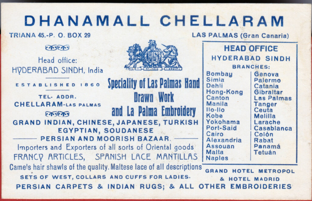 El establecimiento del Grupo Chanrai en Santa Cruz de Tenerife en 1860 fue un punto más de la ampliación de la basta red empresarial Hyderabad Sind, con sede en Gibraltar y presencia en todo el mundo. El grupo siguió creciendo hasta abrir un negocio en el nº 43 de Triana, es decir, junto al de sus compatriotas.